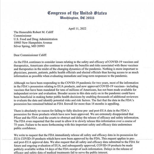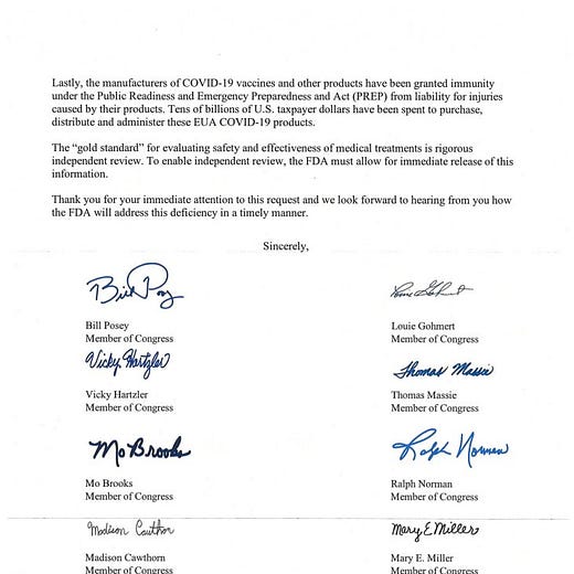 10 Members of Congress demand that the FDA immediately release ALL of the Covid vaccine data in their possession.